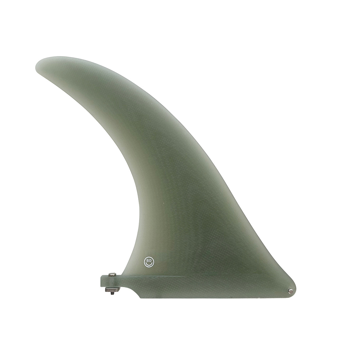 The fiberglass fins are made by laminating a cloth, which is also used for surfboards, hardening it with resin, cutting out the shape, and then sanding each one by hand. The properties of the fiberglass allow the fins to flex and return just enough when turning, giving the board drive.