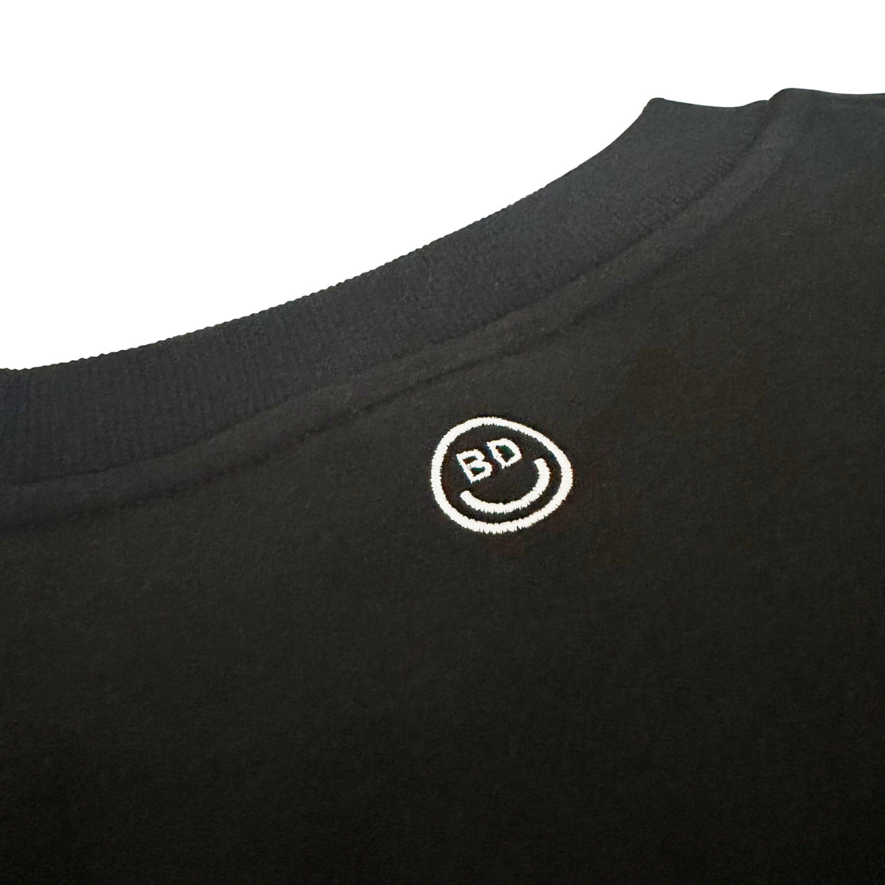Simple design with logo print on the left sleeve and smiley embroidered logo on the back of the collar. This piece features an attractive, trendy big silhouette.