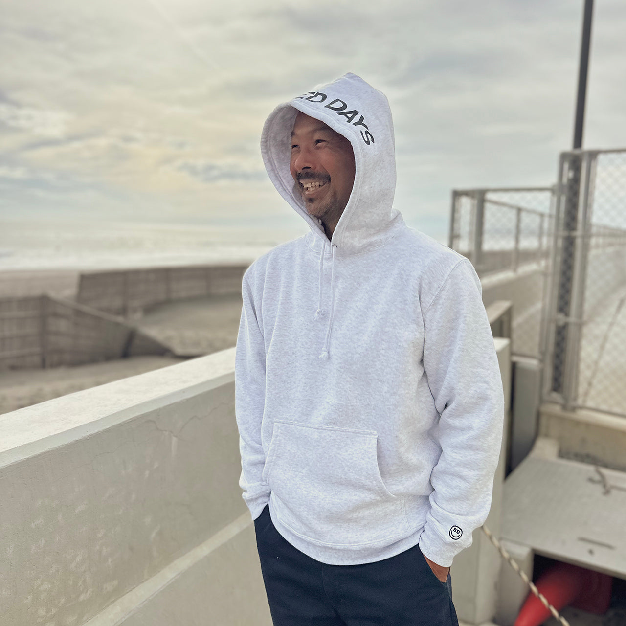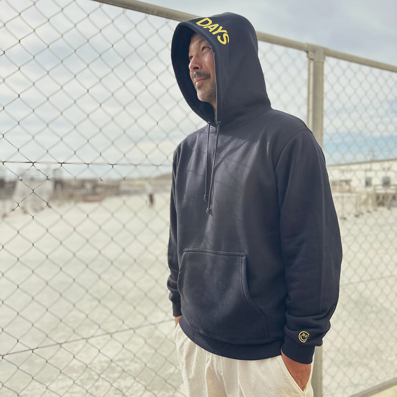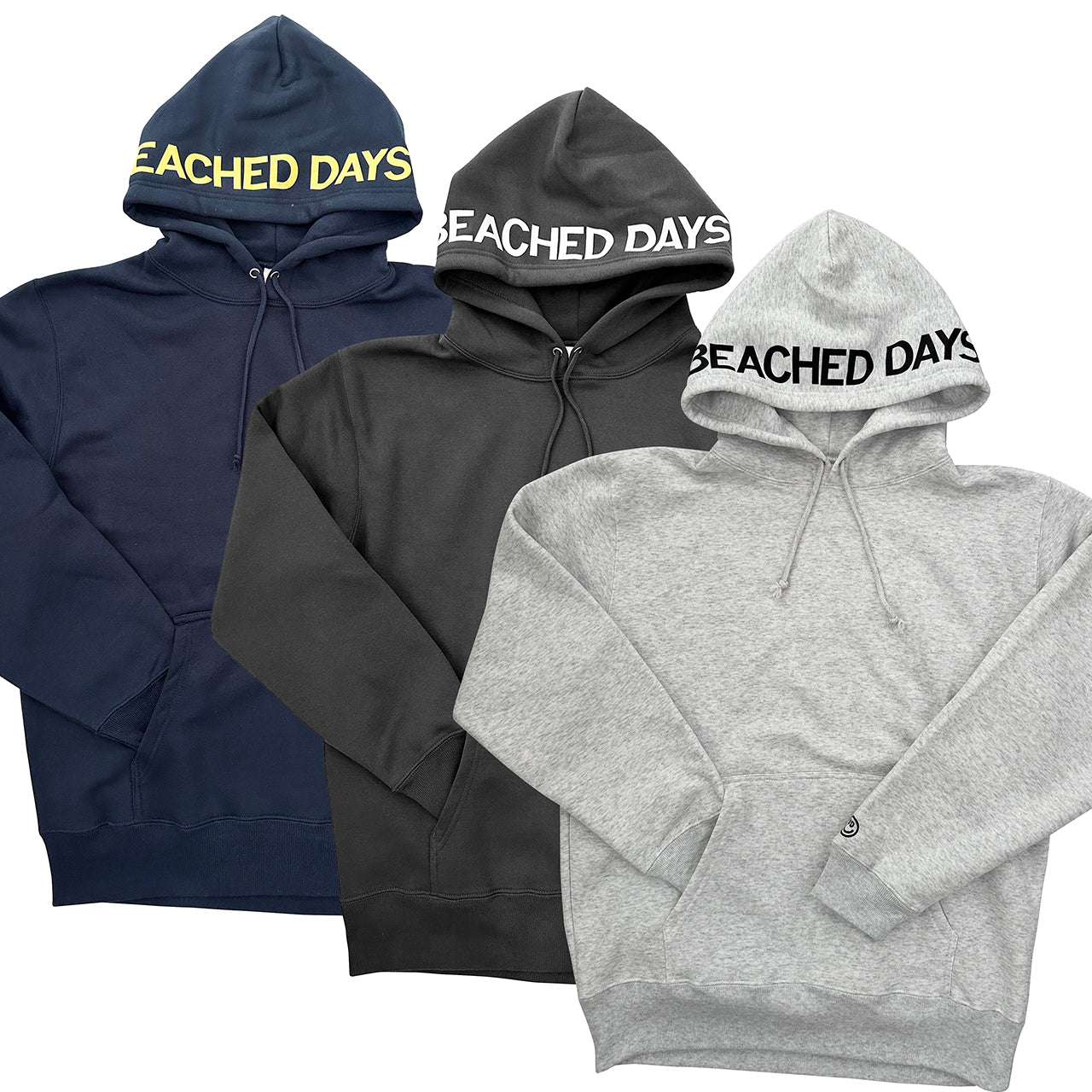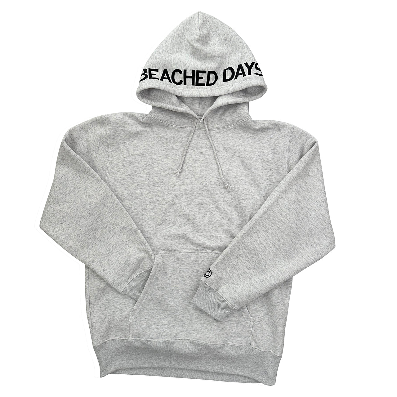 見た目は無地のフーディーと思いきや、フード部分にBEACHED DAYSのロゴをレイアウト袖には刺繍スマイルロゴ、90'sのストリートスタイルアゲインでフードを被るスタイルが◎