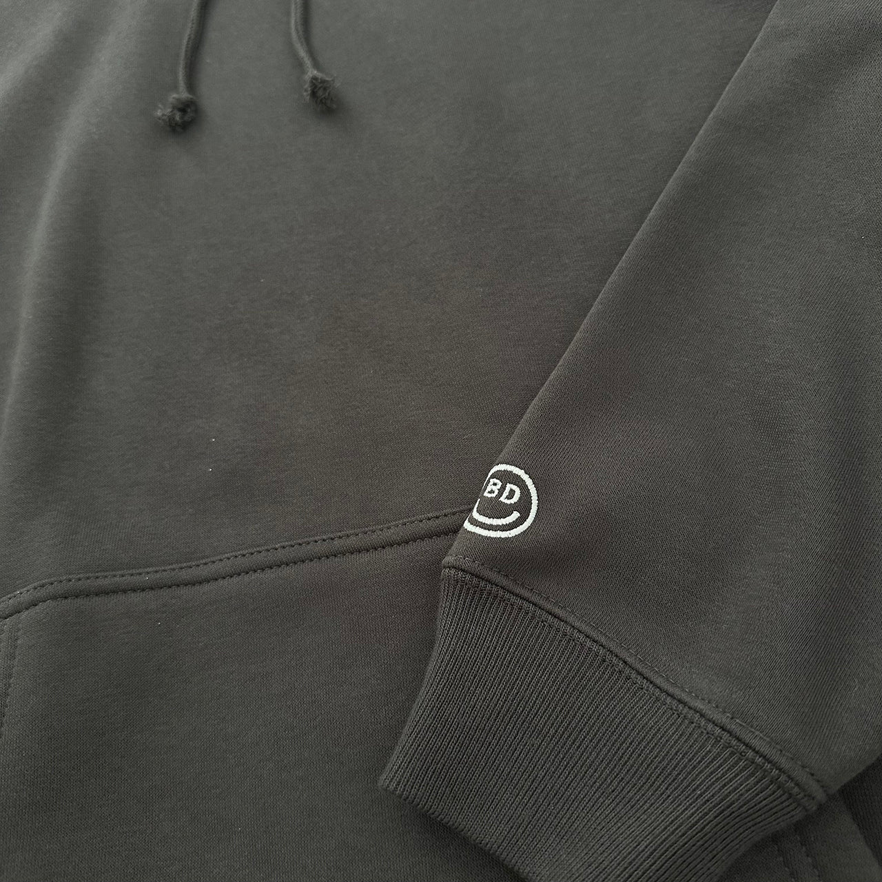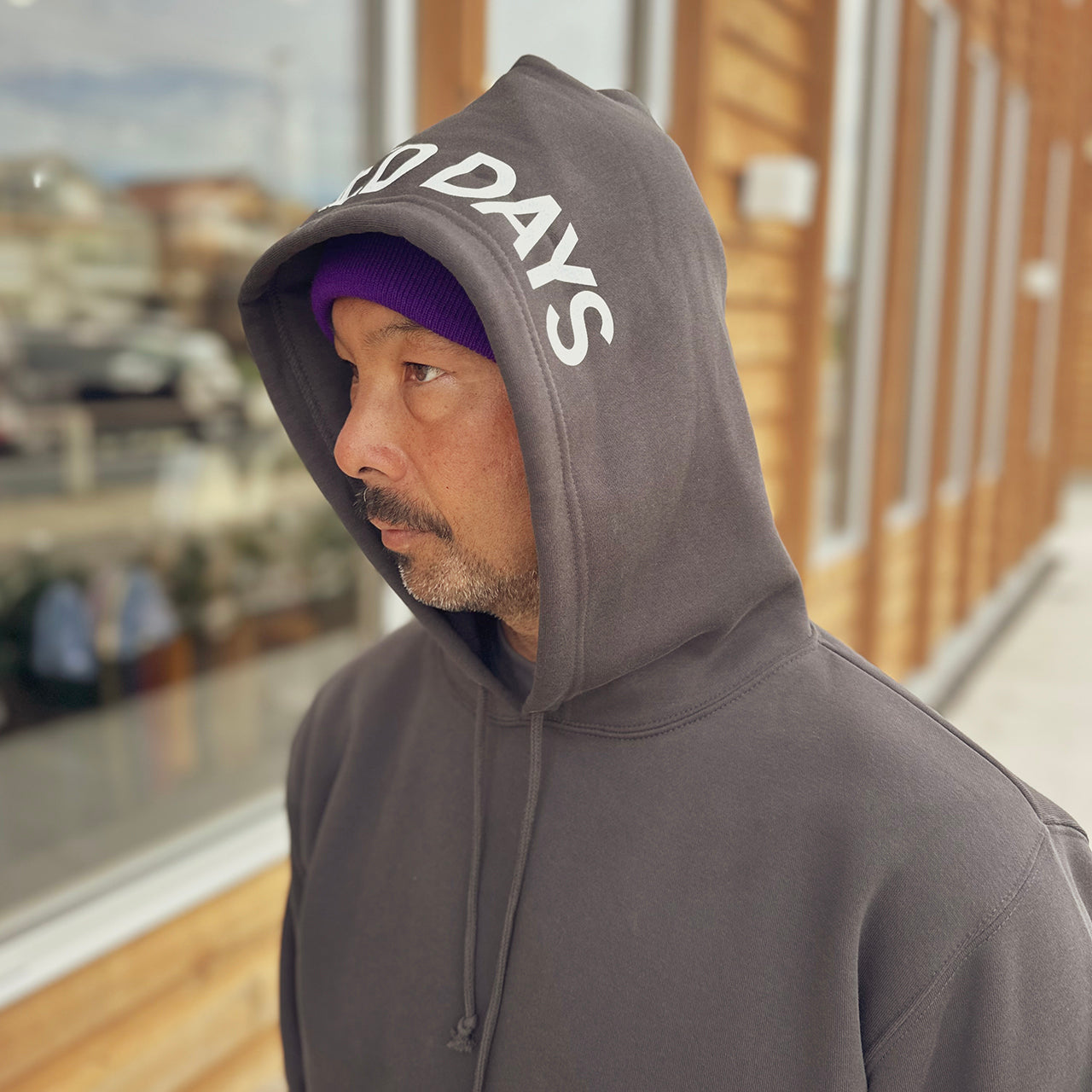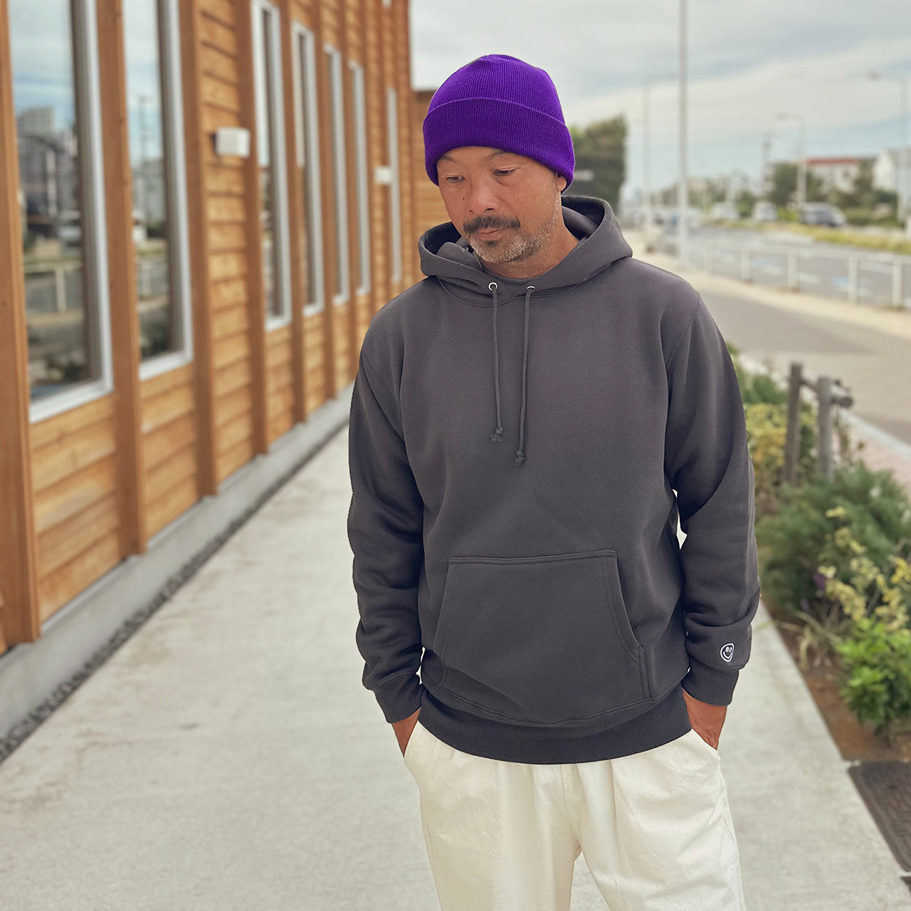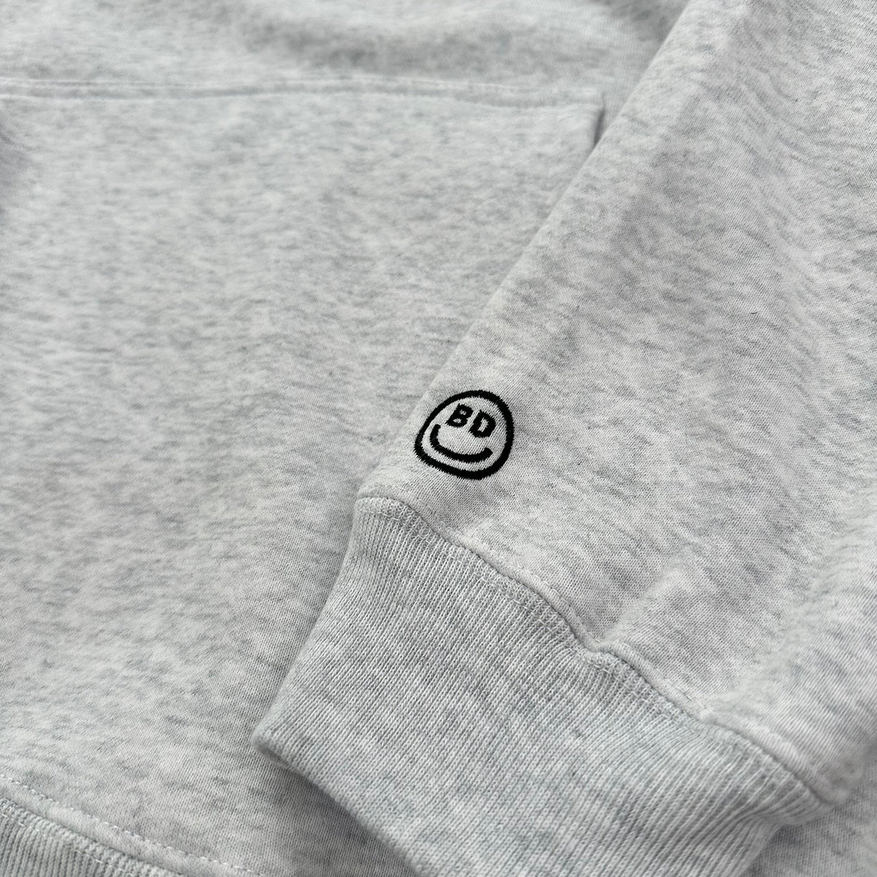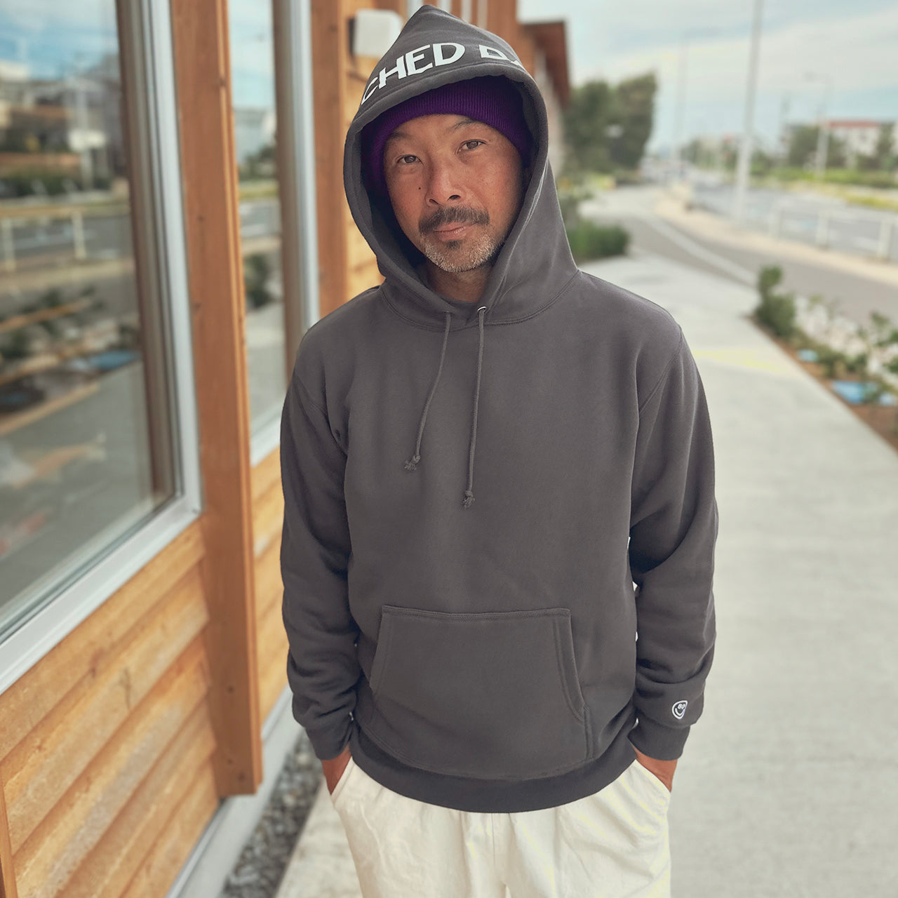 見た目は無地のフーディーと思いきや、フード部分にBEACHED DAYSのロゴをレイアウト袖には刺繍スマイルロゴ、90'sのストリートスタイルアゲインでフードを被るスタイルが◎