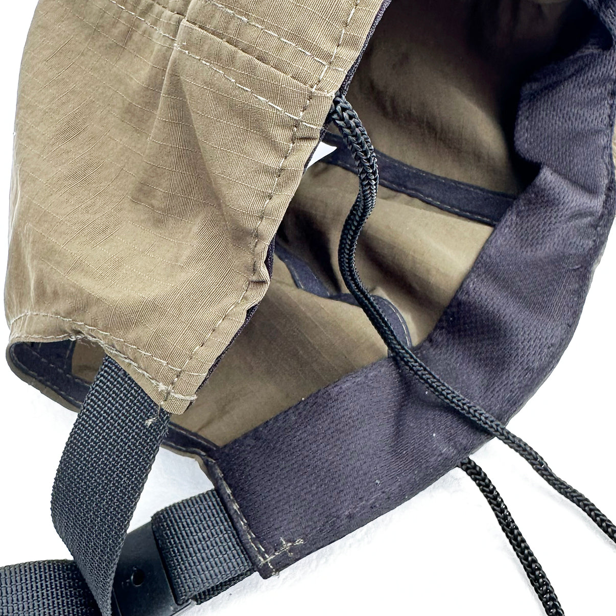 風やサーフィン時のとっさの波にキャップが飛ばされない様、ヒモはガッチリ縫い込んでおります。(取り外しは出来ません)